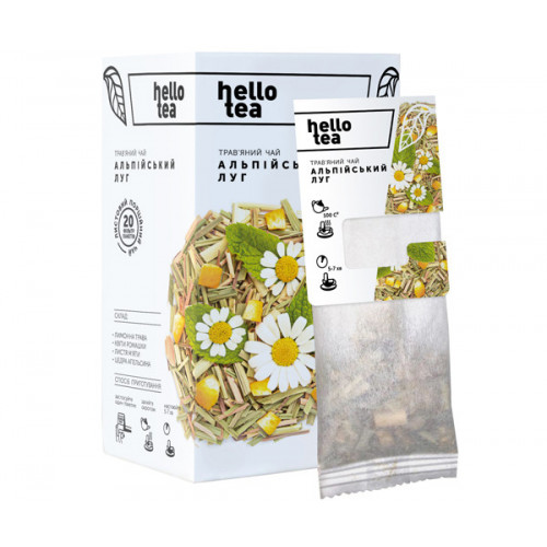 Hello Tea – це український бренд чаїв, який створює унікальні суміші із фруктів, цукатів, трав та спецій. Але крім особливих сумішей ви також знайдете в їхньому асортименті і традиційні зелені та чорні чаї. Трав'яний чай Хелло Ті Альпійський Луг — це відома суміш трав, яка відрізняється насиченим ароматом альпійських трав. У складі кожного пакетика є листя м'яти, квіти ромашки, лимонна трава та цедра апельсина. Заваривши чашку Альпійського Лугу, ви відчуєте всю насиченість природного букета. Легкий трав'яний аромат з фруктово-ягідними нотками, освіжаючий смак і, звичайно ж, величезна користь для організму. Адже м'ята покращує травлення та заспокоює нерви, а ромашка наповнить ваш організм корисними мікроелементами.