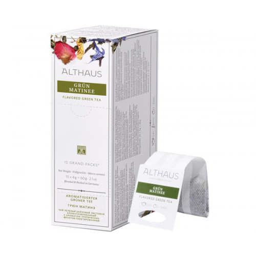 Зелений Althaus Grun Matinee – делікатне поєднання японського чаю та сушених пелюсток. Легкий і запашний, він поєднав у собі медову насолоду та суничні ноти смакового букету з ароматом свіжих польових квітів. Настій має зелений колір і яскравий золотистий відлив, післясмак делікатний і тривалий. Природну гостроту чайного листя вдало відтіняє пурпурова троянда, а пелюстки соняшника та волошок надають напою трав'яно-деревні нотки, огортаючи ранковою свіжістю полів. Завдяки новому формату фільтр-паків приготувати порцію Альтхаус Грюн Матіне стало ще простіше. Температура заварювання має перевищувати 85˚С, інакше частина смакових властивостей купажу може бути втрачена.