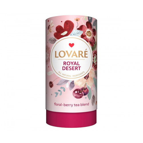 Lovare Королівський Десерт – чай каркаде із центральною фруктово-ягідною композицією, сушеними квітками та вкрапленнями спецій. Сублімовані шматочки ананаса та вишні зберігають властивості свіжих плодів та дарують заряд бадьорості. Шкірка шипшини і цедра апельсина збагачують напій вітаміном С, тому чай має гарну противірусну дію. Китайська троянда та календула заспокоюють та розслаблюють. Кориця і гвоздика додають терпкості та прянощі. Розсипний чай зберігається у багатофункціональному картонному тубусі. Завдяки естетичному дизайну відмінно підійде на подарунок, а після – неодноразово знадобиться в господарстві.