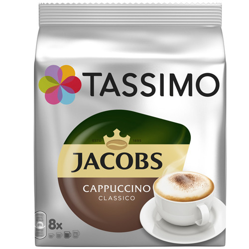 Tassimo Jacobs Cappuccino Classico – капсульна кава німецького виробництва, створена під кавомашини стандарту Tassimo. Це спресована суміш високоякісної арабіки та робусти, поміщена у герметичну капсулу. У процесі приготування вона розкривається завдяки потужному струменю гарячого повітря, а потім під високим тиском змішується з водою. Jacobs Cappuccino Classic – не просто капсули, а повноцінний комплект. У кожній упаковці є окремі Т-диски з кавою та молоком. Одна пачка розрахована на 8 порцій фірмового класичного капучіно – у міру міцного, з тягучим присмаком карамелі. Візитна картка Jacobs – найніжніша молочна пінка і дивовижний аромат, якому неможливо чинити опір.