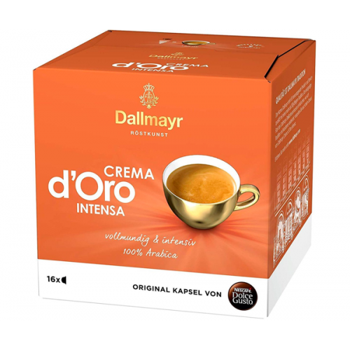 Насичена кава від відомого німецького бренду. Dallmayr Crema d'Or Intensa Dolce Gusto приваблює інтенсивним смаком з легкою гіркуватістю, темним кольором і приголомшливим ароматом, в якому можна відчути оригінальний квітковий букет. Для приготування цієї кави в капсулах використані зерна арабіки середнього ступеня обсмажування. Напій виходить дуже бадьорим. Його рекомендовано пити вранці чи вдень. Поставляється кава у картонній коробці – в упаковці знаходиться 16 капсул.