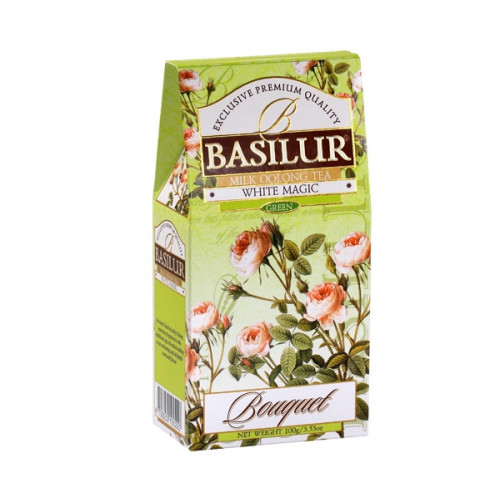 Зелений Улун чай Basilur з колекції Букет Біле чаклунство унікальний напій, який нікого не залишить байдужим. Поєднання ніжної квітки жасмину та пелюсток троянд з дивовижним відтінком вершків вразить будь-якого гурмана та цінителя чаю люкс класу. Після першого ковтка Ви відчуєте легку терпкість після якої настане повітряна м'якість і післясмак залишить після себе солодкий аромат. Прекрасний варіант для подарунка, його корисні якості допоможуть імунній системі бути в тонусі протягом дня.