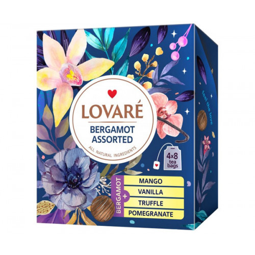 Lovare Асорті Бергамот – пакетований чорний чай у наборі з чотирьох різних смаків на основі бергамоту: