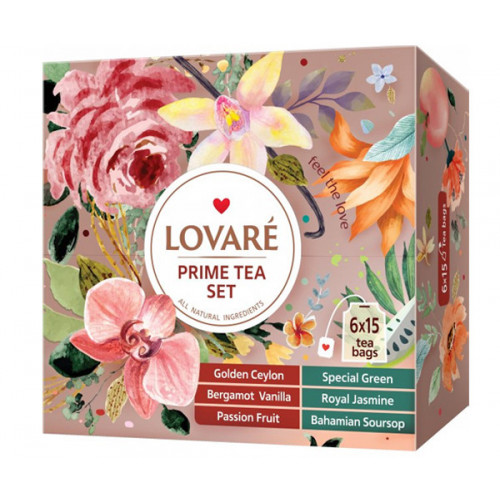 Lovare Prime Tea Set - це 6 найпопулярніших смаків українського виробника Ловар в одній упаковці. 90 пакетиків чаю для ваших бадьорих сніданків та затишних вечорів. В упаковці ви знайдете 6 уподобань по 15 пакетиків кожен. Бленди на основі чорного чаю: Golden Ceylon, Bergamot Vanilla, Passion fruit. Бленди на основі зеленого чаю: Special Green, Royal Jasmine, Bahamian Soursop. Lovare Prime Tea Set підійде як для дому, так і для офісу і навіть для невеликого презенту. Адже виробники дбають не лише про якість чаю, а й приділяють особливу увагу дизайну.