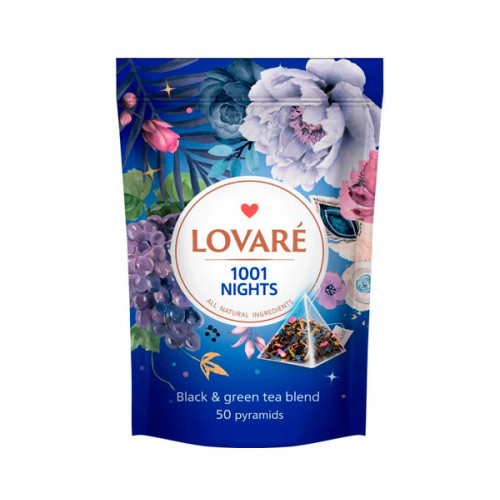 Lovare 1001 Ніч — це купаж чорного цейлонського та зеленого китайського чаю Сенча з додаванням пелюсток сафлори, китайської троянди та волошок. Відмінний варіант для того, щоб підбадьоритися та наповниться жагою до життя!