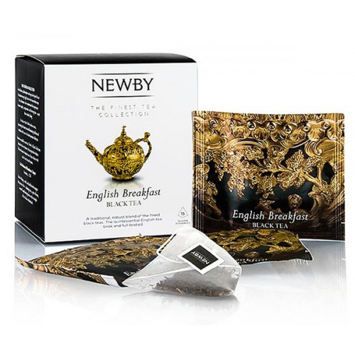 Чорний чай Newby Англійський сніданок один із найстаріших у світі купажів, створений на основі добірних чорних сортів. Цей бленд включає сильно ферментовані листочки, зібрані на найкращих плантаціях у різних точках світу та упаковані в порційні саші, які розраховані на одну чашку. Чашка насиченого бурштинового кольору та багатого смаку ідеальна для початку дня. Кожна пірамідка упакована в індивідуальне саше із алюмінієвої фольги для збереження свіжості чайного листа. Смак такого напою дуже насичений, сповнений благородних терпких тонів.