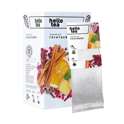 Hello Tea - це бренд чаїв з України, який став відомий завдяки своїм особливим сумішам. Засновники бренду дійшли висновку, що чай може бути не тільки з чайного листя. Він може складатися з багатьох інгредієнтів, таких як фрукти, запашні трави, спеції. Фруктовий чай Хелло Ті Глінтвейн - це напій, який занурить вас у зимовий вечір у колі улюблених людей, з чашкою зігріваючого глінтвейну. У складі кожного фільтр-пакета безліч інгредієнтів: корінь солодки, кориця, гвоздика, імбир, пелюстки суданської троянди, цедра апельсина, мускатний горіх, чорний і рожевий перець. Завдяки такій різноманітності натуральних інгредієнтів, фруктовий чай виходить дуже насиченим, ароматним і звичайно ж смачним!