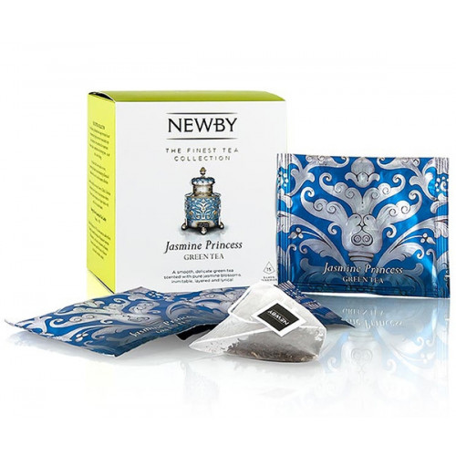 Зелений чай Newby Жасминова принцеса - це вишуканий чай з Китаю, ароматизований за допомогою білого жасмину. Оброблені листочки змішують з найніжнішими квітами, суміш просочується ароматами і ми отримуємо заварку з яскравим букетом жасминовим. Цей сорт тонко і солодко пахне жасмином, а також демонструє м'який, гармонійний смак із нотками трав та квіткового нектару. Кожна пірамідка упакована в індивідуальне саше із алюмінієвої фольги для збереження свіжості чайного листа.