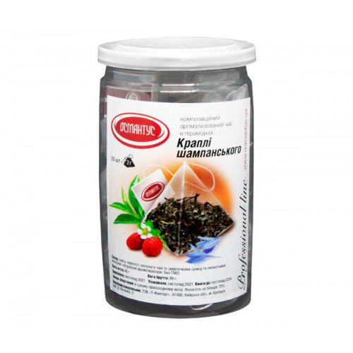 – це оригінальний напій із багатим смаковим букетом. У його складі – листи китайського та цейлонського чаю з різними добавками: шматочки полуниці, листочки волошки, натуральні ароматизатори. Напій пропонується до замовлення у пакетиках у вигляді пірамідок, що максимально спрощує процес заварювання: покладіть пакетик у чашку, залийте гарячою водою та зачекайте кілька хвилин – вуаля, ваш напій готовий! Пакетики чаю Османтус Краплі шампанського зберігаються у скляній баночці. Це збереже смак та аромат купажу до того моменту, як ви вирішите його заварити.